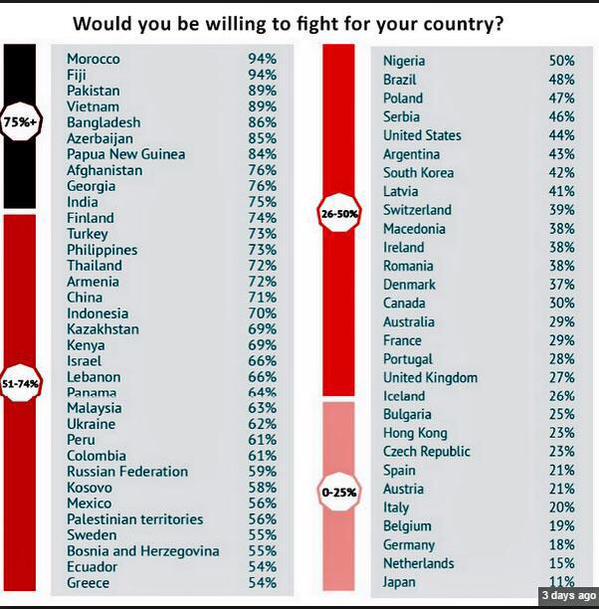 Het is al decennialang rustig aan deze kant van Europa, maar mocht er onverhoopt een Derde Wereldoorlog uitbreken heeft Nederland een probleem: slechts 15 procent van Nederlanders zou bereid zijn te vechten voor het vaderland. Althans, als we de cijfertabel geloven die de laatste dagen de ronde doet op Twitter en diverse blogs.
