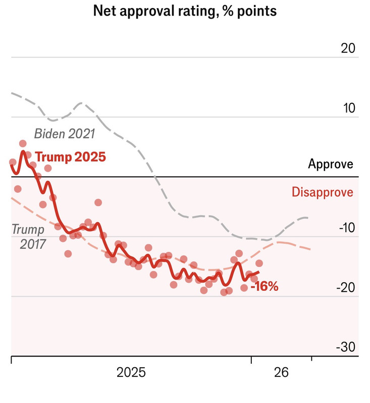De peiling reflecteert de oplopende onvrede van Amerikanen over hun dure boodschappen, hoge energie- en zorgkosten – en over Trumps laconieke reacties daarop. Hij noemde de zorgen op dit vlak eind vorig jaar nog 'een hoax'. Daarmee lijkt Trump in dezelfde val te trappen als zijn Democratische voorganger Biden, die de destijds optimistische macro-economische situatie ten onrechte gelijkstelde aan de dagelijkse realiteit van zijn landgenoten.