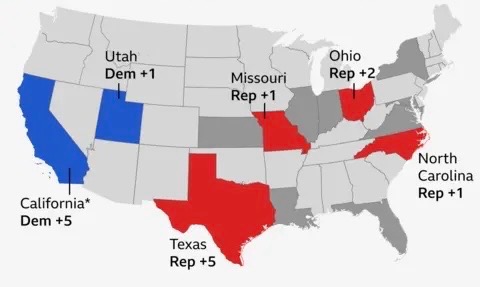 Hier begon de eerste slag om zetels in juni toen trump de Republikeinse partij in Texas opdracht gaf om meer zetels te verkrijgen. Het gevolg was een herschikking waarbij de republikeinen een geprojecteerde winst van +5 zetels behalen. Het voorstel was controversieel omdat er net een herschikking is geweest. Het leidde tot een onthouding van stemmen door de democraten die zelfs de staat ontvluchte met arrestatie bevelen als gevolg. De stemming haalde het uiteindelijk en leek even door een federale rechter teniet gedaan te worden maar het hooggerechtshof heeft uiteindelijk met een 6-3 stemming alsnog ingestemd